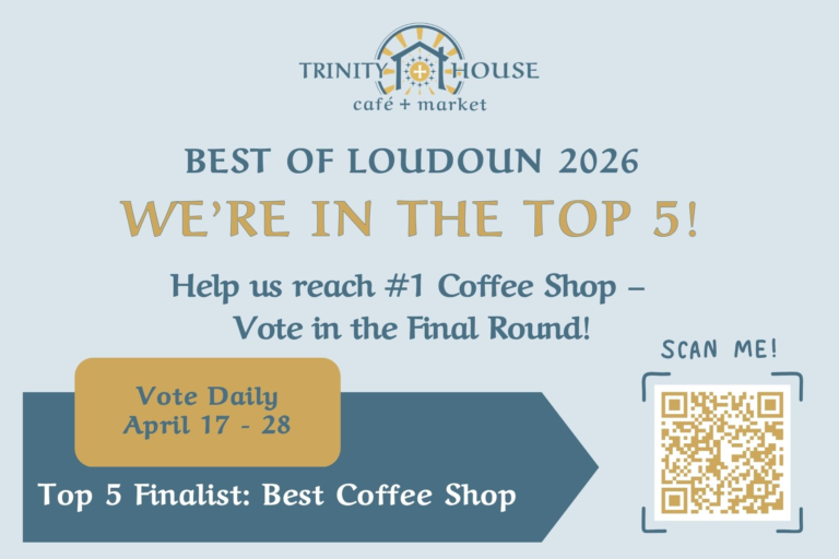 ➤ We’re in the Top 5! Trinity House Cafe + Market is in the Top 5 nominations for Best Coffee Shop in the Best of Loudoun Contest. Thank you to all who voted for us in the first round! Help us reach #1 in this second round. Vote daily from April 17-28. (Vote here)